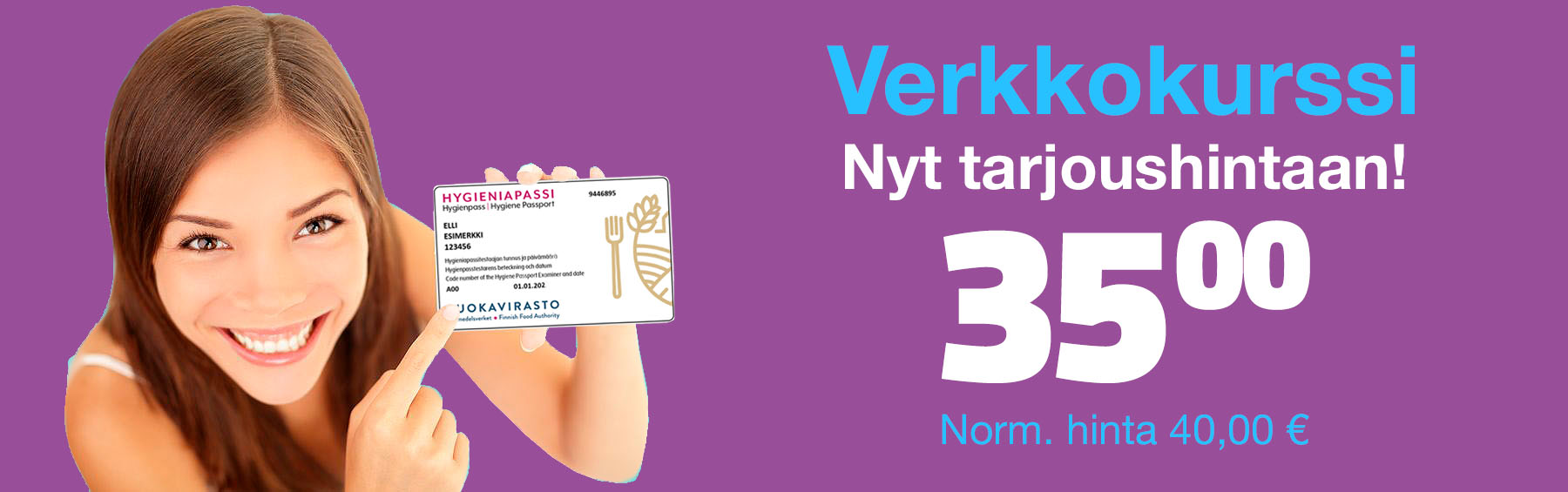Maksat vain kurssimaksun ja pääset opiskeleman loput kuusi oppijaksoa. Kun olet suorittanut verkkokurssin, osallistut viralliseen hygieniapassitestiin. Kurssimaksuun sisältyy testijärjestely mahdollisuuksien mukaan paikkakunnallasi.